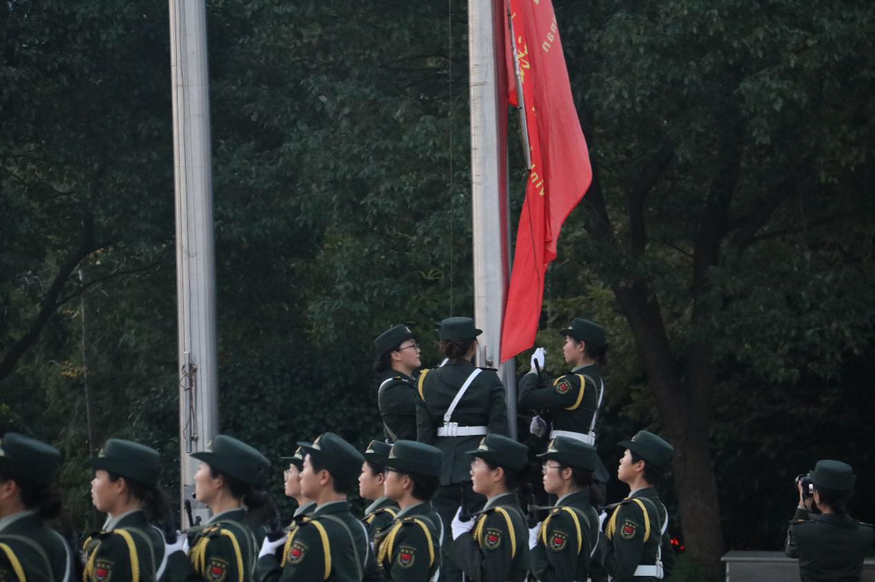 在微亮的晨曦之下,威廉希尔体育官网师生和校纠察队成员到达了修业广场。在嘹亮的《歌唱祖国》的歌声中,威廉希尔体育官网员工纠察队国旗班成员整齐划一地走向升旗台,随着升旗手掷地有声的“升——国——旗”,中华人民共和国国歌奏响,鲜艳的五星红旗缓缓升起。紧接着,威廉希尔体育官网校旗也在悠扬的校歌中冉冉升起。